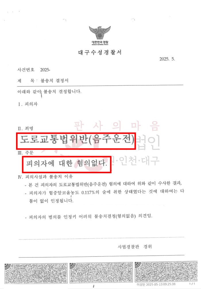 이와 같은 자료를 제출하고, 판심 법무법인의 오랜 경험에서 나온 '양형자료 가이드라인'에 따라 의뢰인이 불송치돼야 하는 이유를 상세히 입증하고 밝혔습니다.